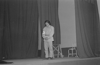 Fotografía en blanco y negro donde puede apreciarse al actor José Soza durante el montaje de _Tela de cebolla_. La fotografía correspondería a una fecha estimada durante el año 1971.Pertenece al [Archivo Patrimonial de Artes Escénicas de la…