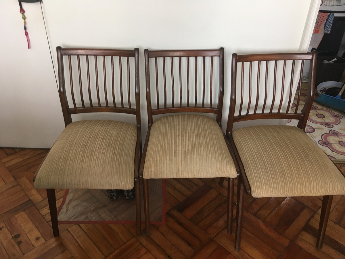 Tres sillas de segunda mano compradas en el persa Bíobio de Santiago para ser usadas en el montaje de Ivanov, dirigido por Rodrigo Pérez. Fotografía tomada en la casa de la diseñadora.