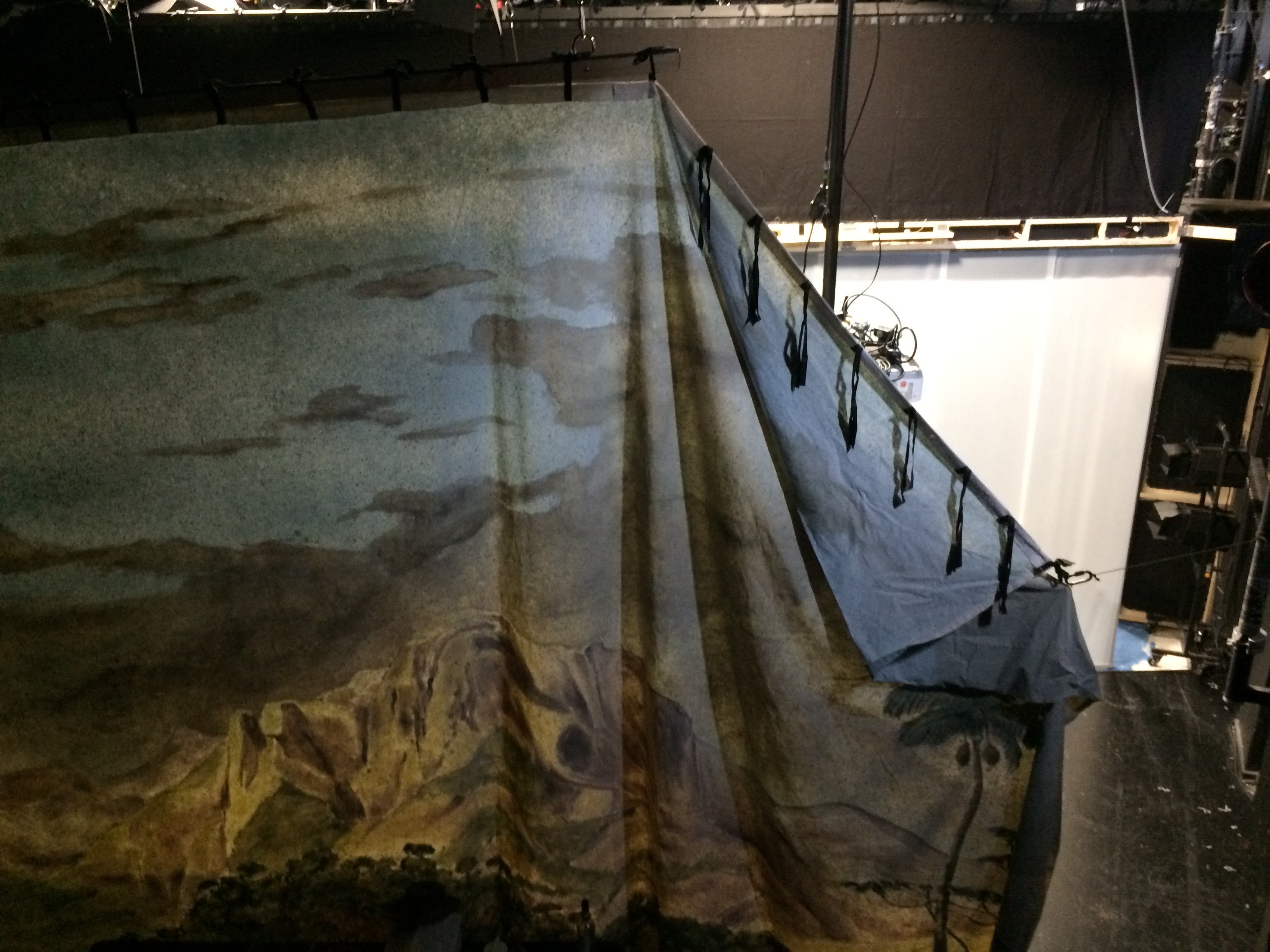 en Abril de 2017. La imagen capta la parte posterior de la pantalla (tela blanca) y cómo detrás de ella se ve por el costado la gigantografía de la pintura Mandioca de Rugendas.