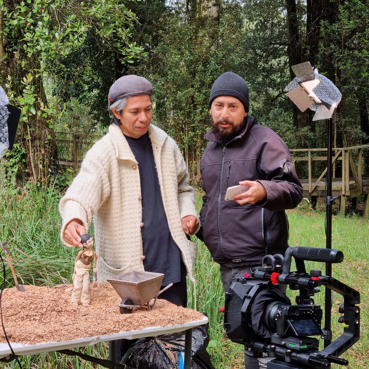 Fotografías del rodaje Cápsula 2. "El aserrinero", realizado en Parque Urbano El Bosque, Valdivia. Equipo creativo: Domingo Araya, textos, manipulación y voces; Marcela Cornejo, diseño integral, confección, manipulación y voces; Félix Vergara, realización audiovisual; Camilo Eque, realización musical.